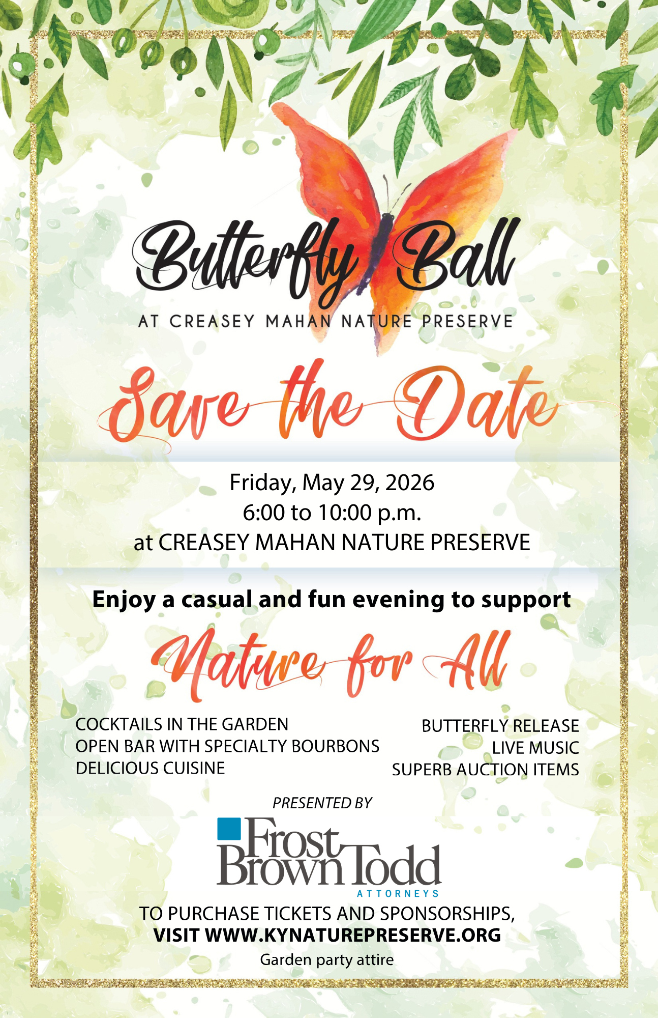 Creasey Mahan Nature Preserve’s eighth annual Butterfly Ball, presented by Frost Brown Todd, will be held on Friday, May 29th. The evening begins at 6:00 p.m. in the gorgeous Woodland Garden setting with open bars featuring specialty bourbons and signature drinks, live music, an exquisite farm-to-fork dinner by Volare, fantastic auction items, and a personalized butterfly experience. WAVE 3’s multiple Emmy-award winner, Shannon Cogan, will be our Host Extraordinaire, accompanied by entertainer-auctioneers Kevin Harned and Bill Menish. Join us for this unforgettable evening!