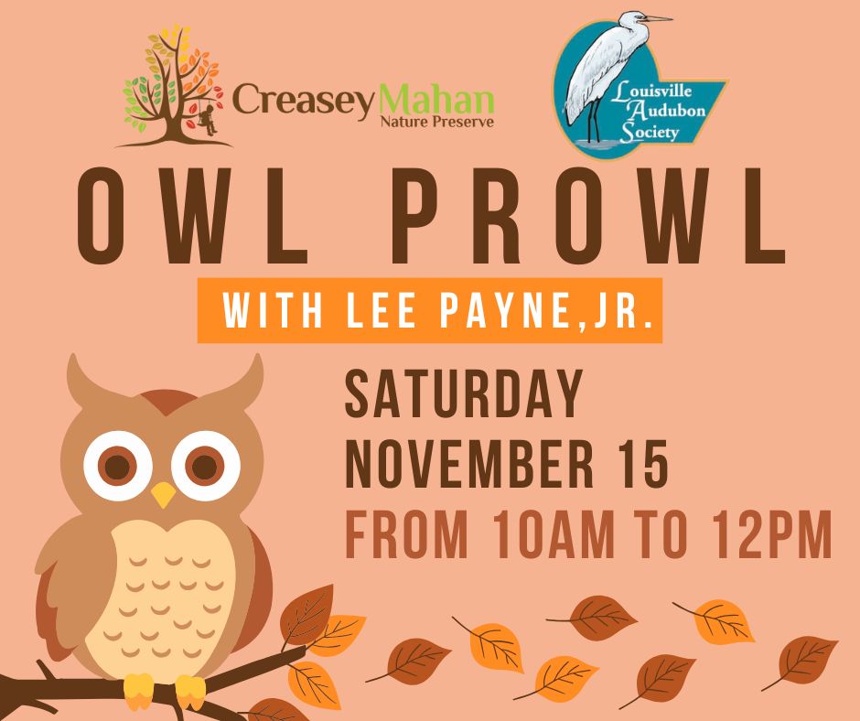 Creasey Mahan Nature Preserve 12501 Harmony Landing Road, Goshen, KY, United StatesWhen: Saturday, November 15th Time: 10:00 a.m. – 12:00 p.m. Donation: $11/person, $6/members, Children 6 and younger are free Where: Meet at the Nature Center Join us for an exciting hike, co-hosted by the Louisville Audubon Society, led by bird expert and "Owl Whisperer" Lee Payne, Jr. Lee has discovered two families of Screech Owls […]