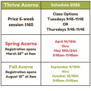 At Thrive Acorns, children ages 18 to 36 months, along with a parent or caregiver, will develop physical, social, and emotional skills as they play in our magical forest classroom. Each class in this 6-week series (held Tuesday and Thursday mornings) will be expertly guided by Ms. Kathryn & Ms. Megan.